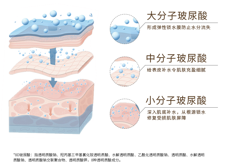 大分子玻尿酸待在皮肤表面,手拉手形成锁水膜,牢牢肌肤水分。