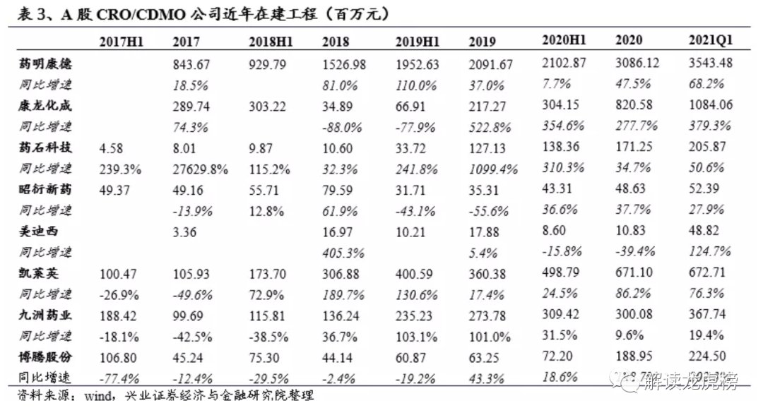 在建工程在一定程度上均反映出CRO/CDMO公司对于产能的投入。近两年,基于行业景气度不断提升,订单需求持续加大,各家头部公司在建工程规模保持快速增长的状态。2020年和21Q1,大部分公司的在建工程投入维持较快增长趋势,例如药明康德、康龙化成、药石科技、美迪西、凯莱英、博腾股份等公司呈现高速增长。这体现出一方面订单需求仍较为旺盛,在产能较为饱和的情况下需要建设新产能,另一方面体现出各家公司对于行业未来发展前景的信心。