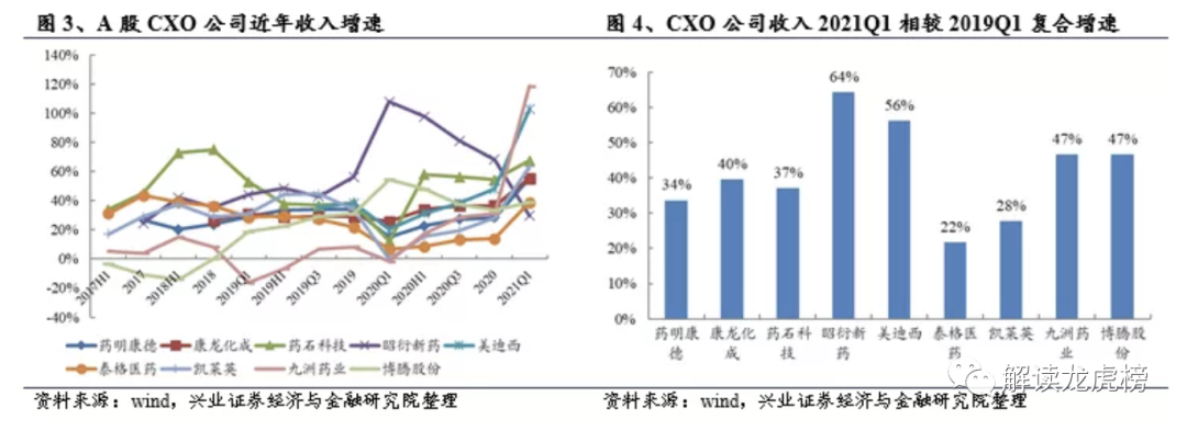相较于利润端会受到较多因素的扰动,收入端是更能反映CXO公司经营情况的指标。20Q1低基数,21Q1实现恢复性高速增长,大部分公司收入增速达到40%以上,部分公司增速超过100%。以19Q1复合增速来看,也能看出CXO板块的业绩确定性和较高的景气度。