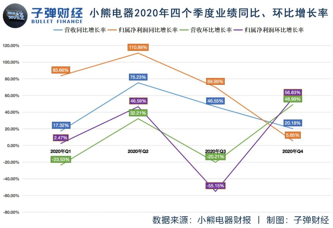一般来说,第四季度是家电的销售旺季,小熊电器2020年第四季度的营收、归属于上市公司股东的净利润分别达到11.62亿元、1.06亿元,分别环比增长48.99%、56.83%,增速创下四个季度中的最高记录。