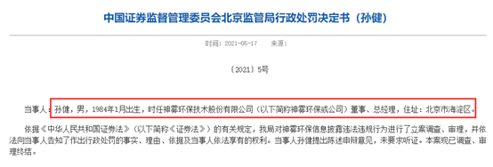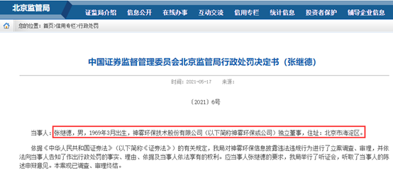 北京证监局开出的上述5份罚单显示,神雾环保技术股份有限公司(以下简称神雾环保或公司)、杜斌(时任公司董事长兼代董事会秘书)、孙健(时任公司董事、总经理)、张继德(时任公司独立董事)、尹丽萍(任公司独立董事),均因构成未按照证券法规定报送有关报告或者履行信息披露义务的行为,被北京证监局开出罚单。
