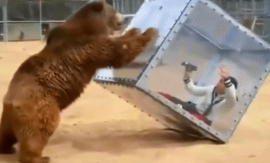 男人玩够了,还要把女生装在笼子里,让大棕熊“玩弄”。