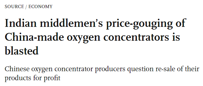 可笑的是,报道里既没有具体的信息源,也没有指明到底是哪家中国企业出口印度的制氧机“不合标准”。