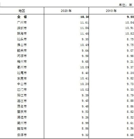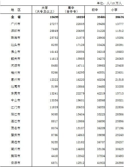 广东省统计局 广东省第七次全国人口普查领导小组办公室 2021年5月15日 根据第七次全国人口普查结果,现将2020年11月1日零时我省21个地级以上市(以下简称市)的人口受教育基本情况公布如下: