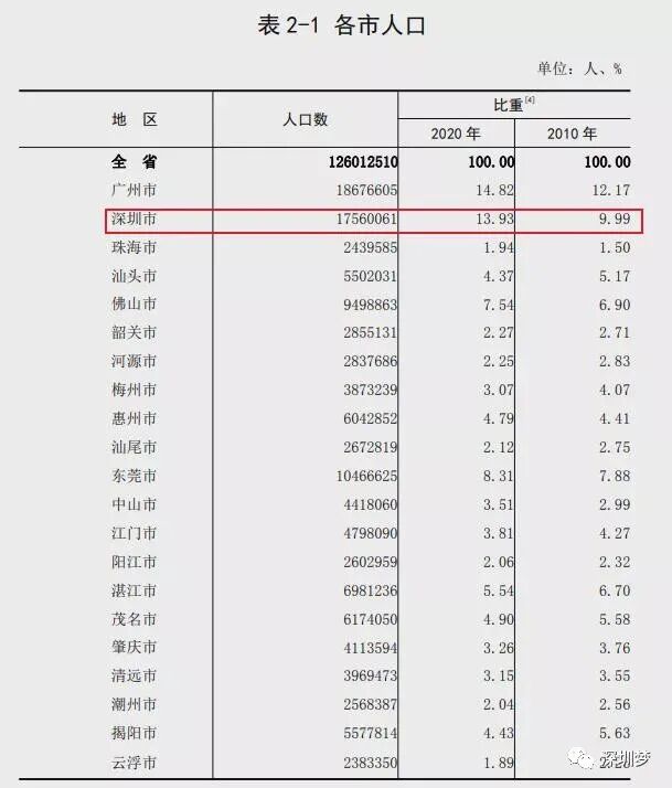 过去10年深圳增加7136531人! 与2010年第六次全国人口普查相比,21个市中,有15个市人口增加。人口增长较多的5个市依次为:深圳市、广州市、佛山市、东莞市、惠州市,分别增加7136531人、5975805人、2304552人、2246388人、1445850人。