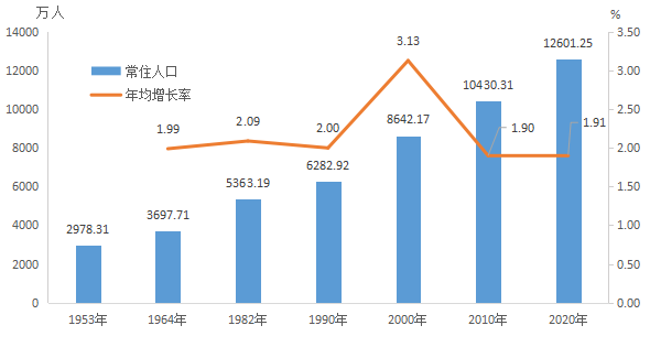 全省常住人口与2010年第六次全国人口普查的104303132人相比,十年共增加21709378人,增长20.81%,年平均增长率为1.91%。