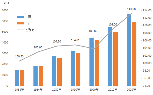 全省常住人口[2]中,男性人口为66873646人,占53.07%;女性人口为59138864人,占46.93%。总人口性别比(以女性为100,男性对女性的比例)由2010年第六次全国人口普查的109.00上升为113.08。