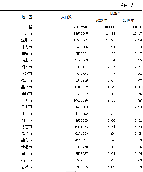 [1]本公报中数据均为初步汇总数据。[2]全省常住人口是指省内21个地级以上市的人口,不包括居住在省内21个地级以上市的港澳台居民和外籍人员。[3]珠三角核心区包括广州、深圳、珠海、佛山、惠州、东莞、中山、江门和肇庆等9市;沿海经济带东翼地区包括汕头、汕尾、潮州和揭阳等4市;沿海经济带西翼地区包括阳江、湛江和茂名等3市;北部生态发展区包括韶关、河源、梅州、清远和云浮等5市。[4]指各地级以上市的常住人口占全省人口的比重,为使口径可比,深圳两次普查人口数据均包含深汕特别合作区。