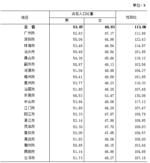 广东省统计局 广东省第七次全国人口普查领导小组办公室 2021年5月15日 根据第七次全国人口普查结果,现将2020年11月1日零时我省21个地级以上市(以下简称市)的人口性别构成情况公布如下: