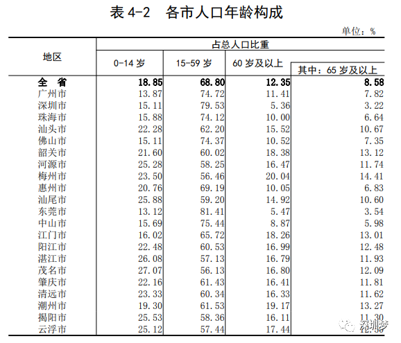 广东省统计局 广东省第七次全国人口普查领导小组办公室 2021年5月15日 根据第七次全国人口普查结果,现将2020年11月1日零时我省21个地级以上市(以下简称市)的常住人口年龄构成情况公布如下: