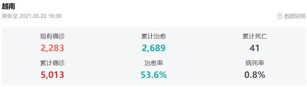 据越南官方公布的数据 ,自5月20日6时至5月21日6时,在过去的24小时内,越南新增113例新冠肺炎确诊病例,其中5例为境外输入性病例,108例为本土社区传播性确诊病例,另外新增2例死亡病例。