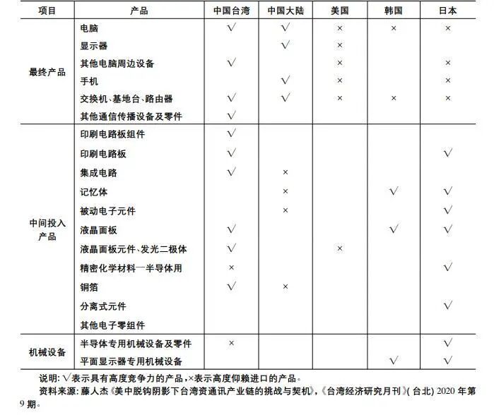 根据《台湾经济研究月刊》2020年第9期,大陆在最终产品,包括电脑及其周边设备,以及路由器等通信设备出口上,有高度竞争力,但在中间投入产品,包括集成电路和铜箔等方面高度仰赖台湾。