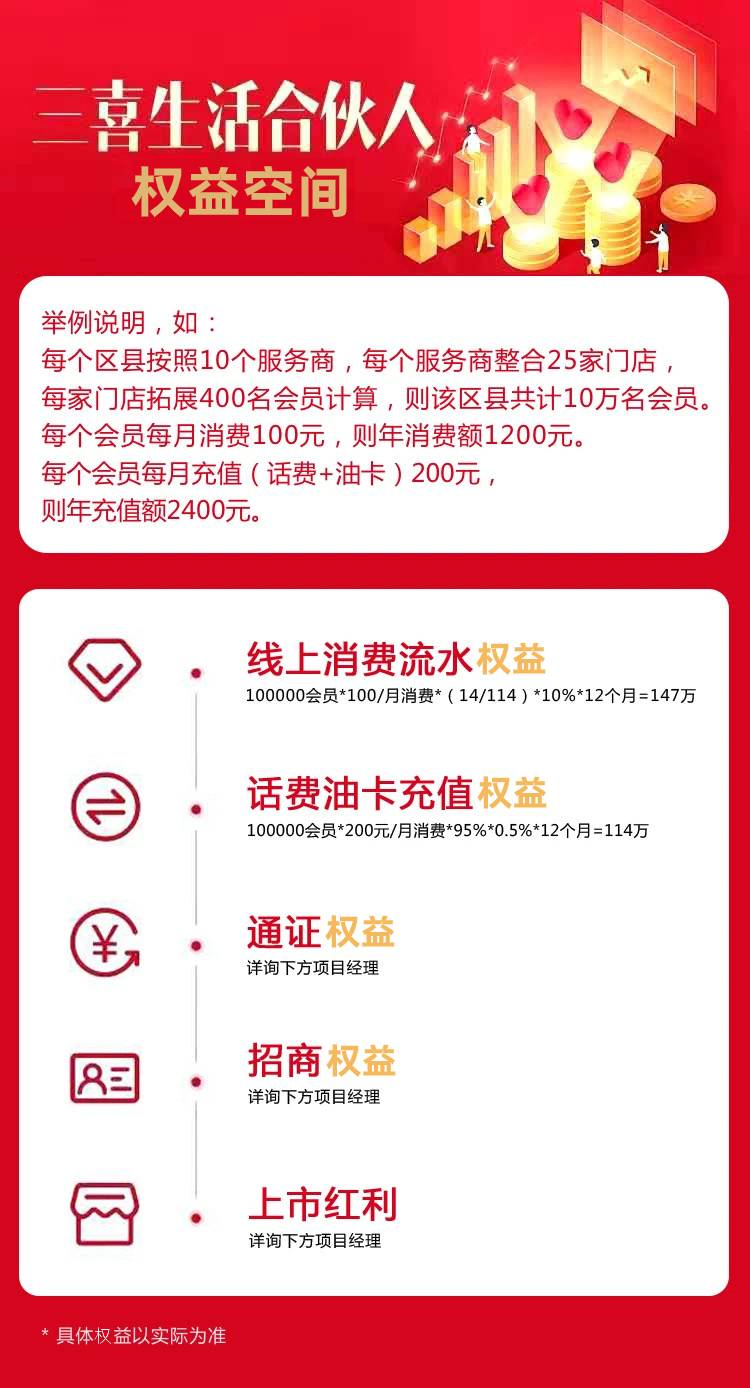 简单的讲,三喜相当于在合伙人所在区域开了一家“ 大型线上Costco商超 ”,合伙人可获得所有“进店”会员的 每一笔消费流水、每一次话费/油卡充值 的权益和分成。