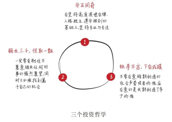 1、三个投资哲学: 守正用奇;弱水三千但取一瓢,桃李不言下自成蹊;风物长宜放眼量,高筑墙,广积粮,缓称王;