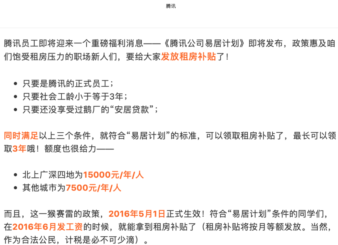 值得一提的是,腾讯不仅在行业内首家推出安居福利计划,还在2016年5月1日推出了“易居计划”。后者是针对社会工龄小于等于三年且未申请过“安居计划”借款的腾讯正式员工,每年可以领取7500-15000元的租房补贴,最长可领取3年。