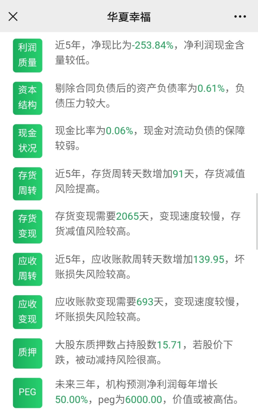 我们知道应收账款有坏账风险、存货会发生各种意外、固定资产也有各种变数,可能会埋下各种风险隐患。比如前文提到的华夏幸福,净现比低,说明净利润现金含量很低,手握千亿应收账款,周转天数增加,变现速度慢,一时难以收回,最终爆发债务危机;再比如盐湖股份数百亿资产1折甩卖无人问津,几十年利润一朝灰飞烟灭。
