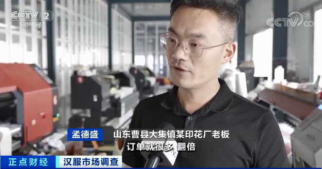 一套汉服的制作流程中,古朴典雅的印花和精美的刺绣必不可少,而当地的印花厂正在加班加点赶制产品。