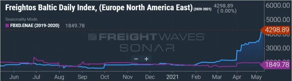 3月26日,FBX的价格为2174美元/FEU,而到了5月7日,价格上涨了65%,达到3596美元/FEU。