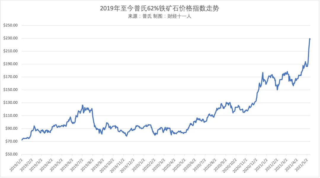 5月10日,普氏62%品位的铁矿石价格达到创纪录的229.55美元每吨,在4月27日刷新历史新高达到193.85美元后,5月6日首次突破200美元并连续3个交易日刷新记录。 过去一年,铁矿石价格涨了160%。