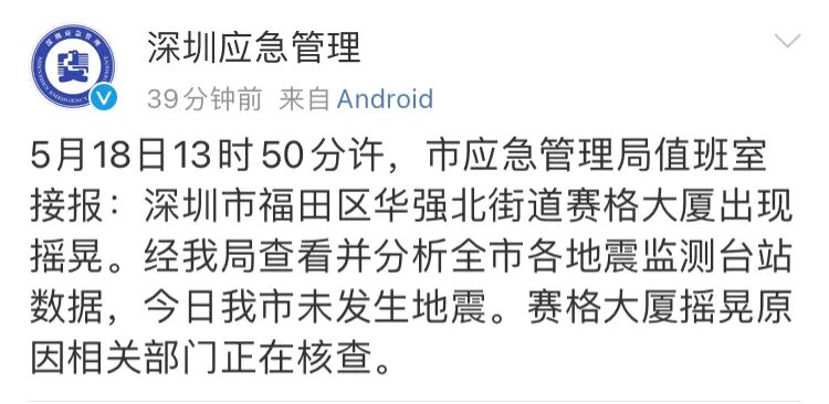 对网传“地震”情况,深圳市应急管理局官方微博发布消息称,5月18日13时50分许,市应急管理局值班室接报:深圳市福田区华强北街道赛格大厦出现摇晃。经我局查看并分析全市各地震监测台站数据,今日我市未发生地震。赛格大厦摇晃原因相关部门正在核查。