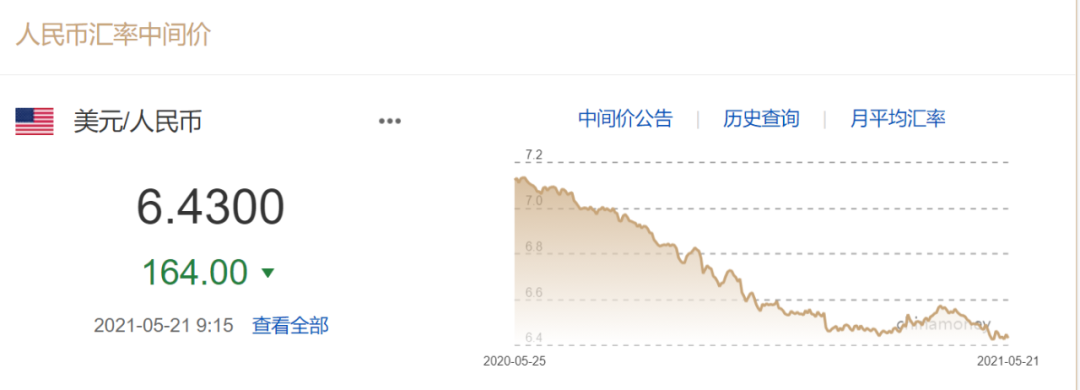 从数据上看,当前人民币汇率保持着平稳态势。5月21日,银行间外汇市场人民币对美元即期汇率表现平稳,收盘报6.4337元,较前值升16点;人民币对美元汇率中间价报6.4300元,调升164点。本周人民币对美元汇率在波动中微升,在岸即期汇率全周升值10点。人民币对美元中间价全周升值225点。