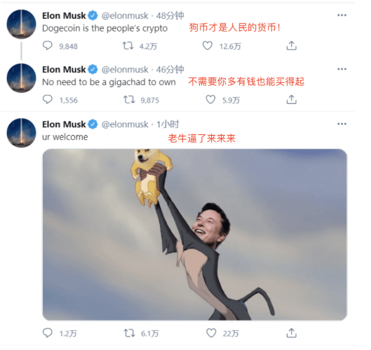暴涨暴跌!完全没有任何规律!比如马斯克说了一句话“ 狗币才是人民的货币 ”,一瞬间,狗币就暴涨。。