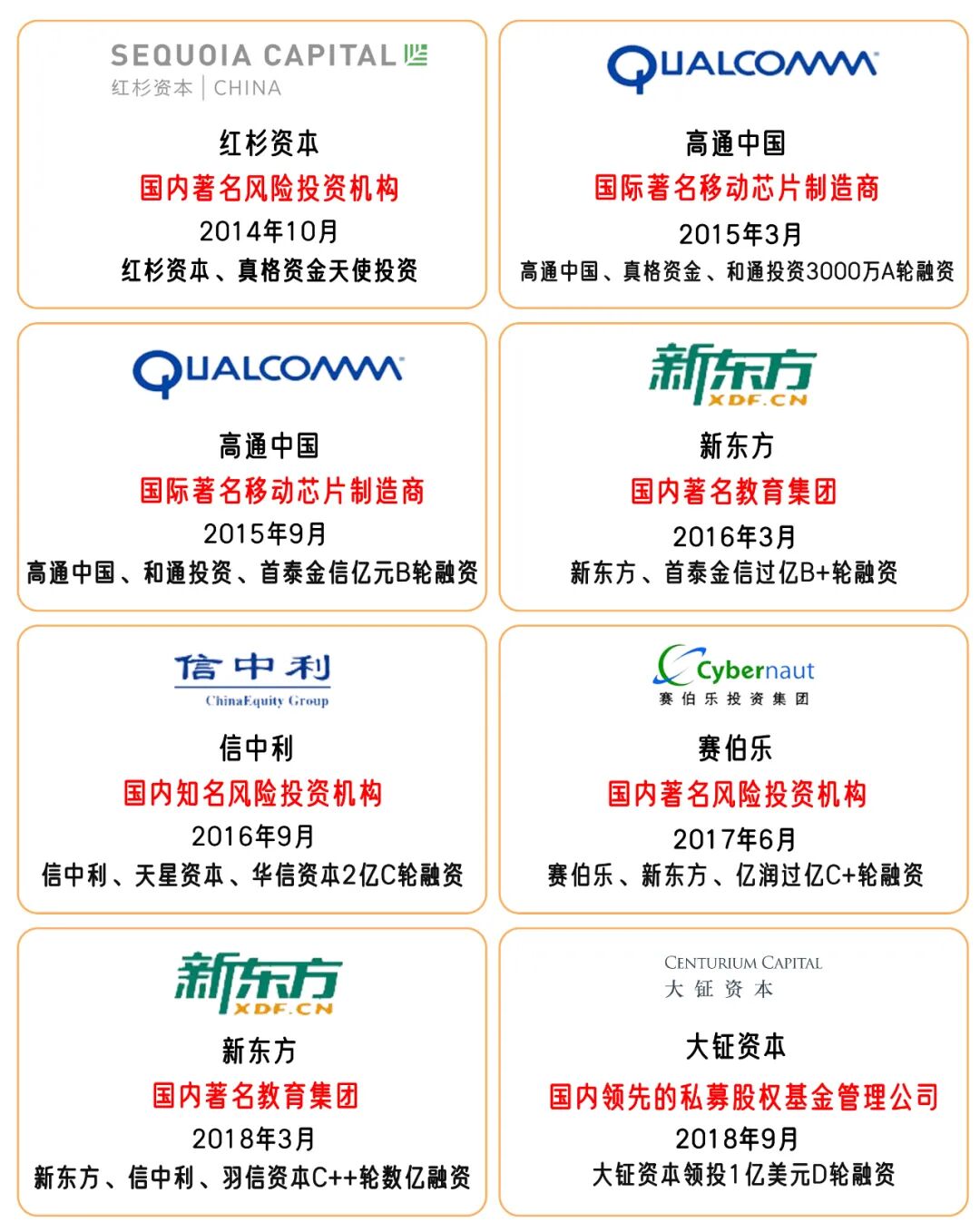 掌通智慧校园先后获得 红杉资本、新东方、赛伯乐华创资本及高通中国等 资本共计 八轮十亿投资。