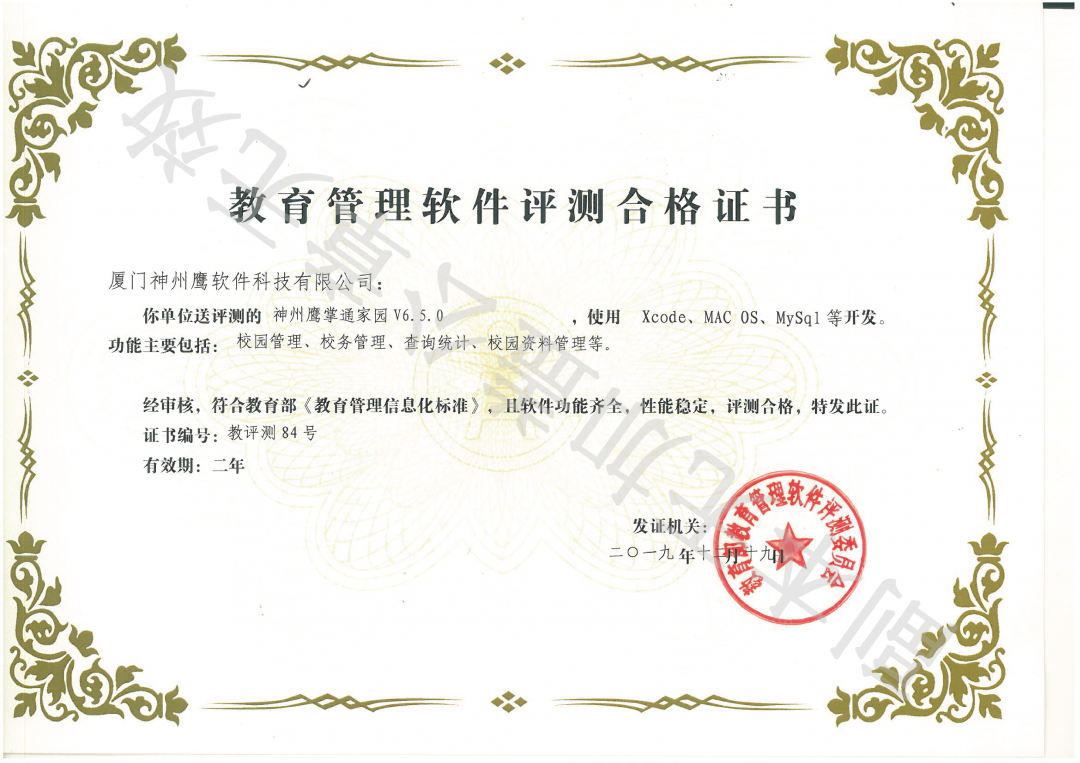 2019年12月 , 掌通智慧校园获得 教育部教育管理软件评测委员会 颁发 教育管理软件评测合格证书 ,该证书是 教育部 为推动 教育部信息化工作 的规范发展而实施的一项管理办法,足以证明掌通家园产品服务的 稳定性。