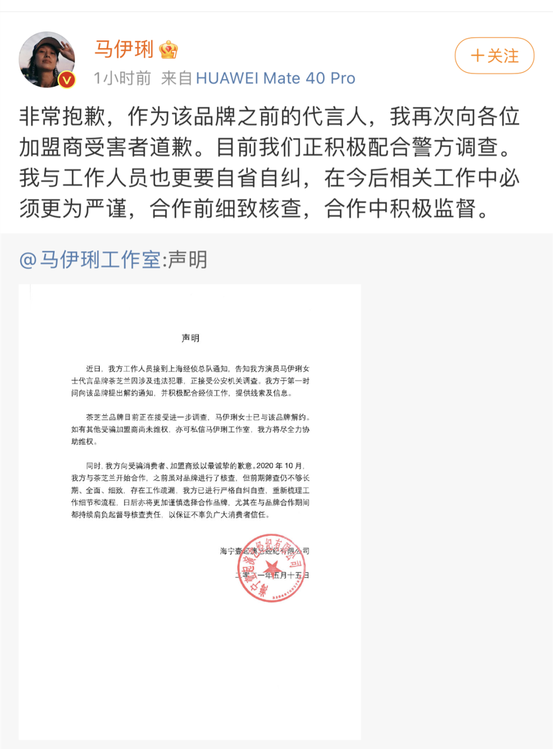 随后马伊琍道歉: 非常抱歉,作为该品牌之前的代言人,我再次向各位加盟商受害者道歉。