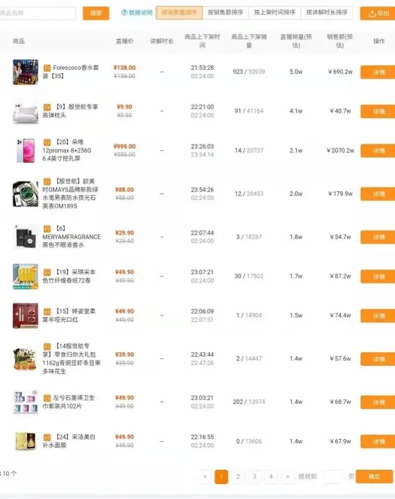 这场直播中,销量最高的产品是一款单价为138元的香水套装,售出5万套,销售额为690.2万元。销售额最高的是单价为999元的朵唯手机,售出2.1万件,销售额为2070.2万元。