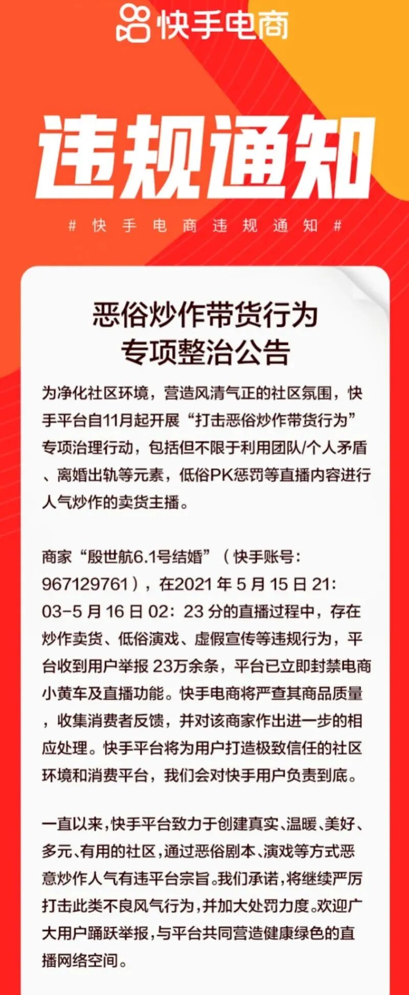 根据快手平台的公告称,收到用户23万条举报,反映商家“殷世航6.1结婚”在5月15日的直播中,存在炒作卖货、低俗演戏、虚假宣传等行为。目前已立即封禁电商小黄车及直播功能。