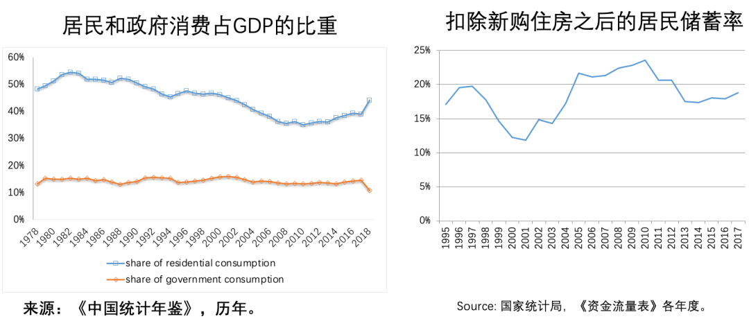 进一步看消费的变化,其实主要是居民消费占GDP比重的变化,因为企业按照会计准则是没有消费的,而政府消费占GDP比重几乎没有变化。而如果看居民储蓄率的变化,从扣除新购住房之后的居民储蓄率来看,20多年来波动非常大,上世纪90年代实际上是在下降的,本世纪头十年非常高,之后又开始下降,已经不到20%,并不是那么高。