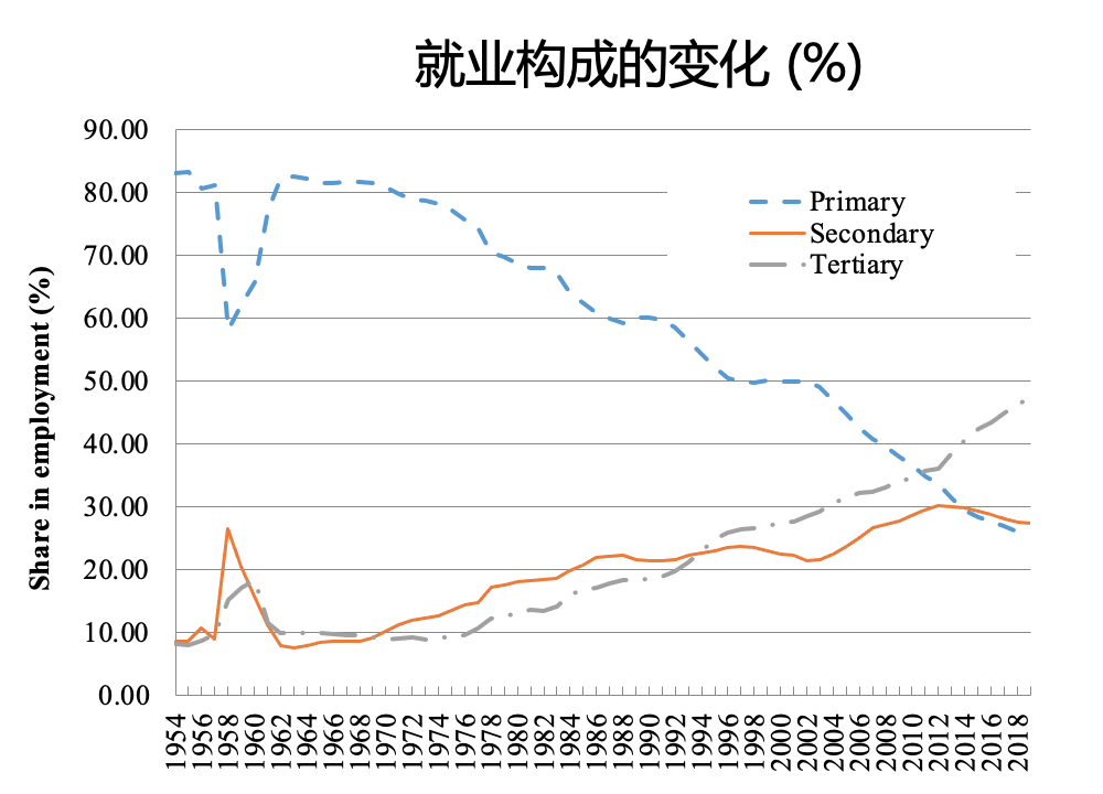 从就业构成来看,我们的工业化发展在本世纪头十年非常非常快,第二产业就业占比在2010年达到顶点,随后就开始下降。