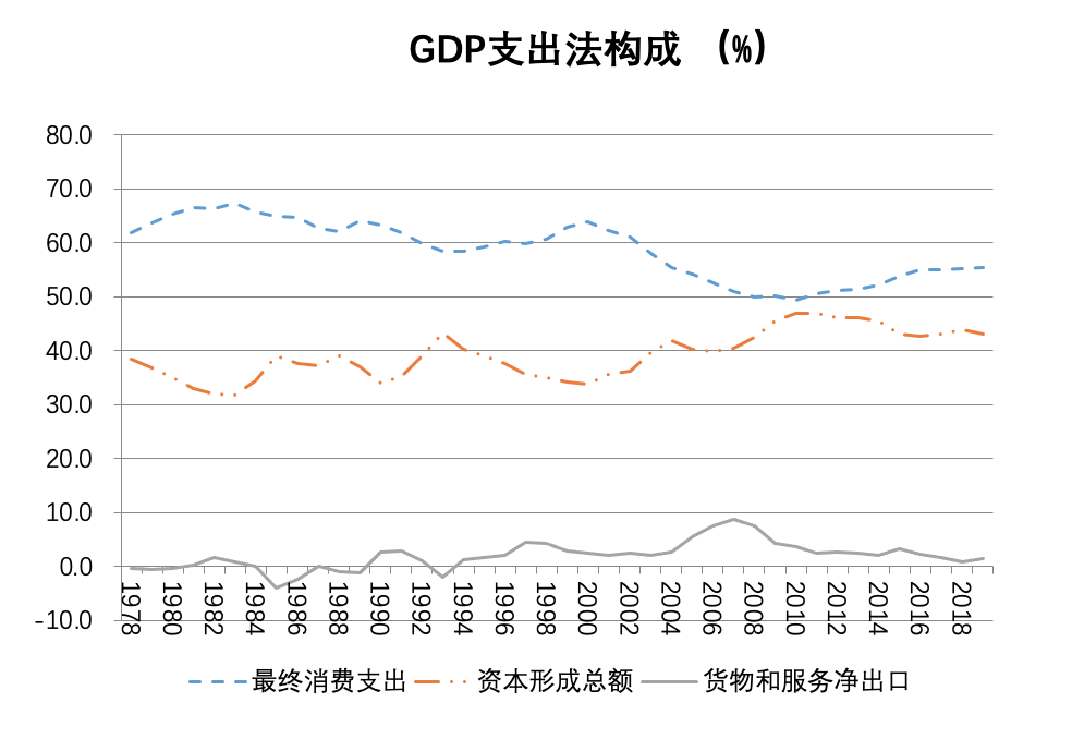 从中国经济结构的变化来看,改革开放以来,我国净出口占GDP比重最高峰达到9%、10%,实际上一直是比较低的,因此经济增长主要还是看消费和资本形成。