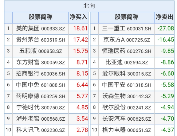 从近7天北向资金十大活跃个股成交及资金流向角度看,美的集团净买入额18亿元居首,贵州茅台和五粮液净买入额分别为17亿元和15亿元位列二三。三一重工近7天北向资金净卖出额达27亿元位列榜首,京东方A和恒瑞医药净卖出额分别为16亿元和9亿元排名二三。