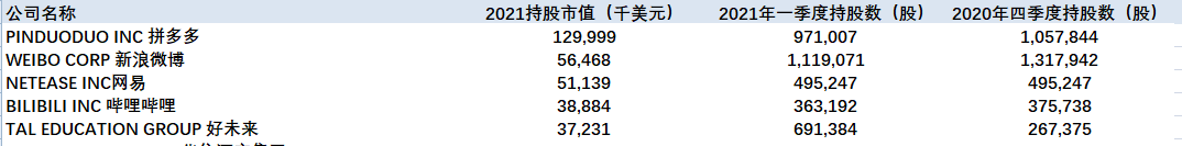 此外,哔哩哔哩持有的市值为38,884万美元,百度仅有4,600千美元,对应的在操作上高毅资产也是大幅减持百度。而涂鸦智能、京东、唯品会均是新进的,持股数分别为6,973股、41,000股和370,000股。而贝克找房相较于去年四季度,加仓5128股。