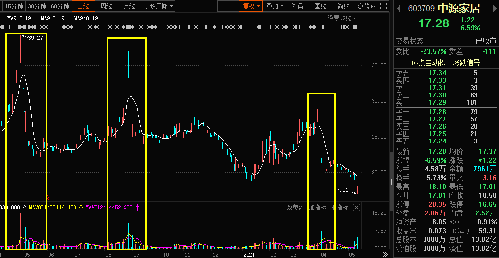 以遭叶飞点名的中源家居为例,其总市值目前为13.82亿。近一年,其股价经历了数次闪崩,每次均为在没有显著消息面的情况下发生,从成交量来看,其股价上涨阶段与资金增量也出现了较为明显的量价背离。