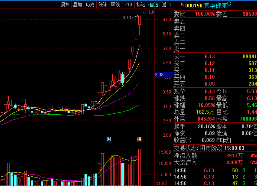 医美+养老+民营医院概念股,换手五板,目前市场高度板,周五市场高标只有一个五板,一个三板的都是医美方向,可见资金仍然看好医美方向。宜华健康这票周五之所以说是捡钱的票是因为周五开盘一个小时不到的成交量就赶上了前面几天全天,股价始终能维持在均线附近震荡,可见承接非常好,那有资金引导上板就是大概率事件了,所以这票直接低吸即可。而且周五整体市场是转暖的,无论资金回不回流题材股这种市场高标资金都不会放过,周五上板成为市场高标是很合理的事。