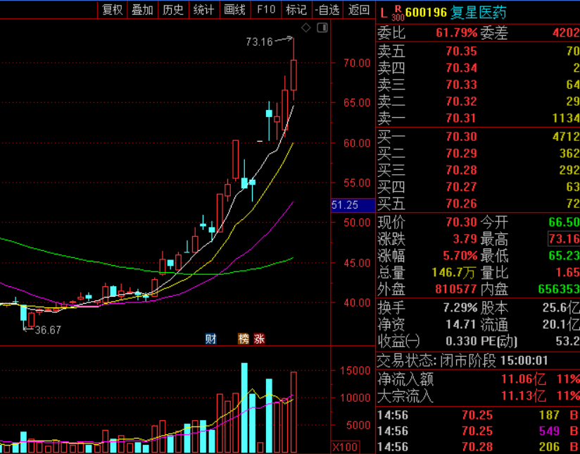 跟大家讲这个票不是说让大家参与这个票,毕竟盘子这么大而且这么高了,只是告诉大家,如果资金不看好医药方向,这种大盘股没必要这么猛怼,复星医药这种票都能走这么猛,其他医药股是不是更有关注价值?
