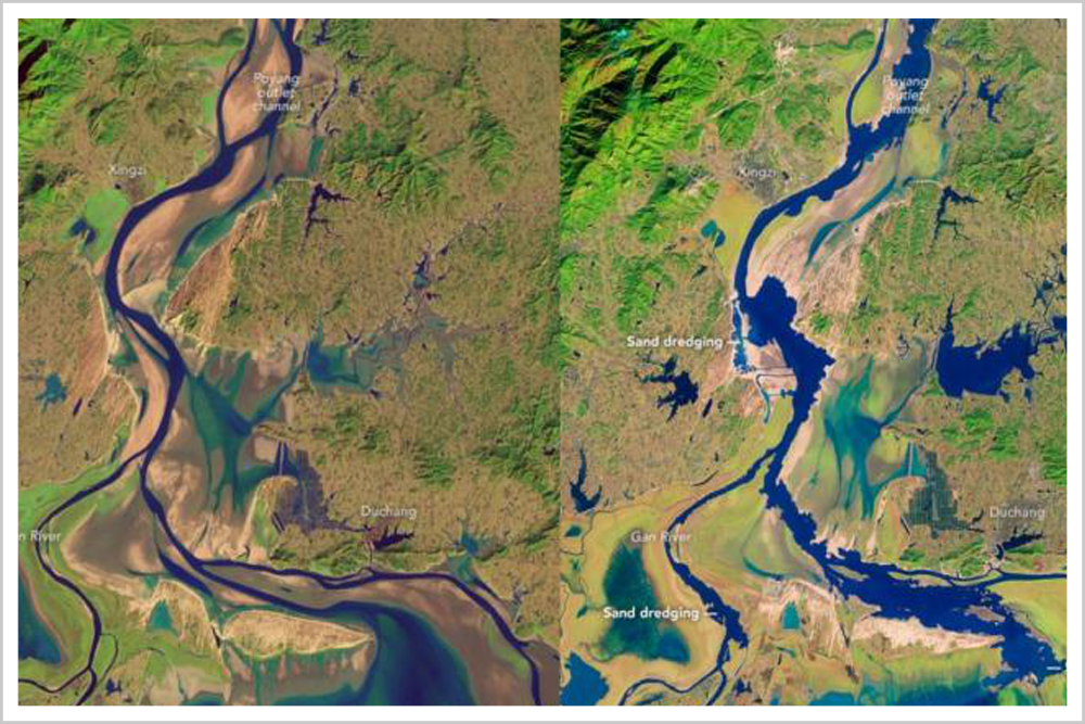 ▲被挖空的鄱阳湖,1995年12月与2013年12月对比