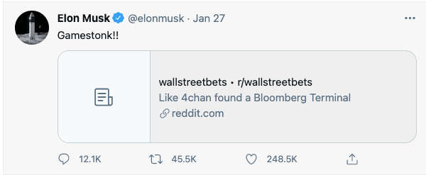 一位散户头子从人群中涌现。 就在众多资本大鳄目睹散户的疯狂无动于衷的时候,马一龙发推特支持了Gamestop,正是马一龙的支持,让散户们得以找到一位真的大哥。 正是这位大哥带领散户们发起了第二次抱团大战。