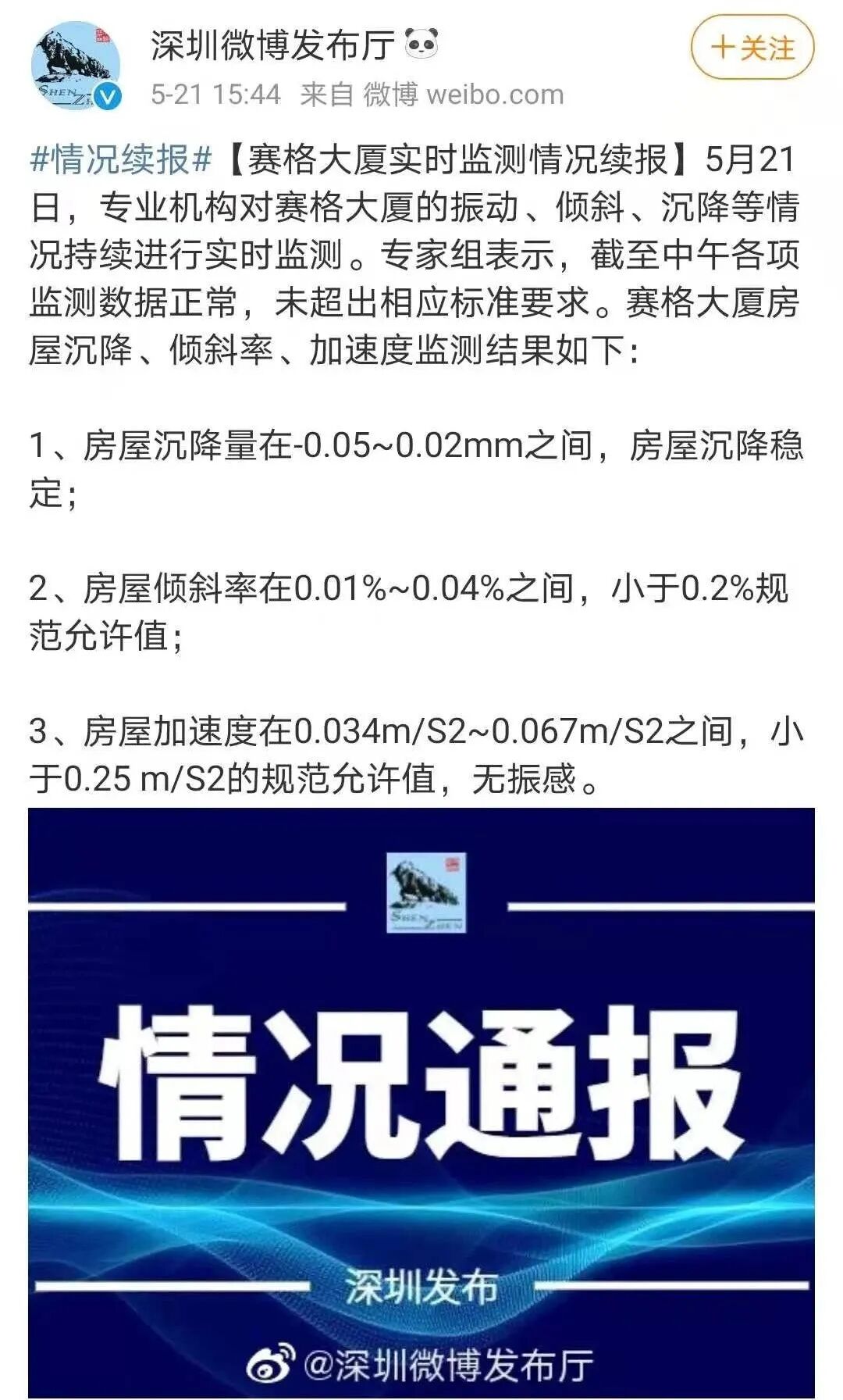 据深圳微博发布厅消息,5月21日,专业机构对赛格大厦的振动、倾斜、沉降等情况持续进行实时监测。专家组表示, 截至中午各项监测数据正常,未超出相应标准要求。