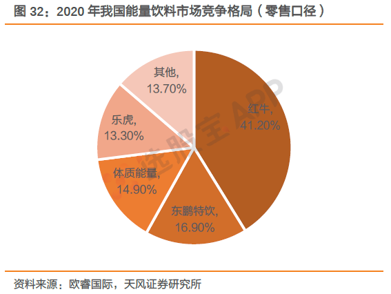2020年红牛、东鹏特饮、体质能量、乐虎四大品牌共实现能量饮料零售额386.44亿元,在我国能量饮料市场零售总额中占比高达86.3%。其中红牛独占41.2%的市场份额,为我国能量饮料第一大品牌;东鹏特饮位居第二,占比16.9%。
