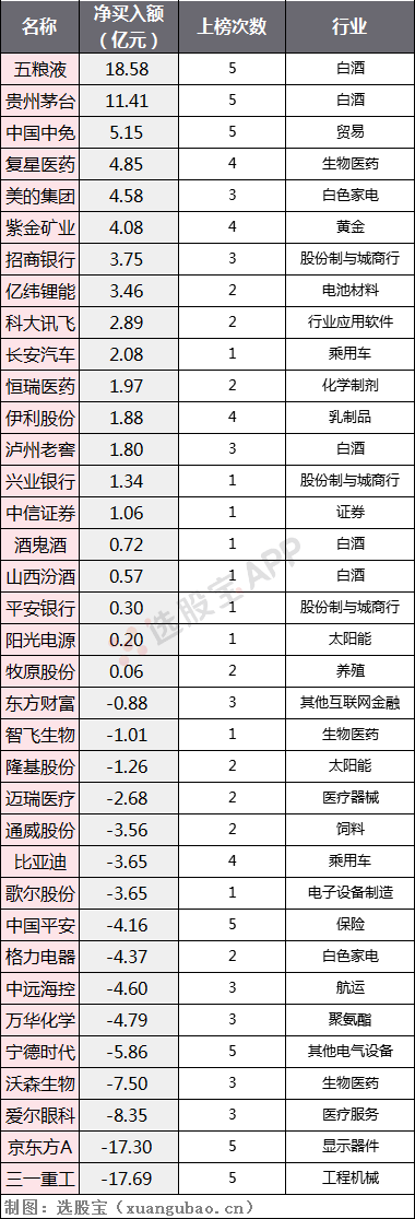 上周,两市合计共有36只个股表现活跃,其中20只个股获净买入,从行业上看,白酒行业被买入最多,榜单中共有5只,其次为新冠防护题材。