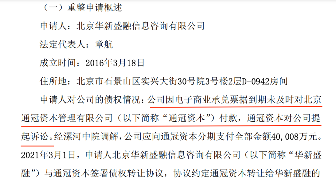 诉讼还未有结果,不过与普天的购销合同,又牵出银鸽投资融资性贸易的问题。知情人向野马财经(微信公号:ymcj8686)分析, 孟飞留置,与融资性贸易有关。 野马财经此前拿到的一系列销售合同显示,从2018年8月到11月,银鸽投资向普天国际密集采购了至少约7.85亿元的乙二醇。 这些乙二醇的单价在7200元/吨左右,交货地点为“张家港长江国际港务有限公司罐交割”,交货方式为“张家港长江国际网上仓储服务平台交给需方,办理交割手续后需方自提”,结算方式为“预付105天(150天)商业承兑汇票”。 由于交割方式为自提,结算方式为承兑汇票,中间的可能性太多了。裁判文书网上公示的虚构贸易案中,多是以这种货物自提和承兑汇票结算形式进行的。 银鸽投资在《回复公告》中解释,如此大规模采购乙二醇是为了锁定货源,降低采购成本。 但是野马财经(微信公号:ymcj8686)联系上的银鸽投资原中高层人员介绍,乙二醇并非生产纸张过程中的主要原料,银鸽投资用料非常少,每年几千万元足够了,上述单据中巨额的采购量远超正常需求。 在银鸽投资与供货方或客户的贸易往来中,大部分付款方式为商业兑汇票形式。据统计, 截至2018年末,预付给供应商未解付(兑付)的应付票据余额8.77亿元,向客户收取的未解付(兑付)的商票余额8.09亿元。 上交所曾在问询函里曾提出一个问题——银鸽投资多起大宗贸易是否真实,由此产生的近9亿元票据又是否涉嫌虚开。 虽然银鸽投资予以否认,不过这些商票为银鸽投资日后的破产重整埋下伏笔。 2020年4月,“中植系”的北京通冠资本管理有限公司(以下简称“通冠资本”)起诉银鸽投资,要求其偿还4.0008亿元。 起诉原因是,通冠资本向河南融纳电子商务有限公司(以下简称“河南融纳)借款3.71亿元,河南融纳按照约定将其持有的出票人为银鸽投资、票面金额为4.0008亿元的电子商业承兑汇票背书转让给了通冠资本。现在河南融纳未能按照约定还款,而银鸽投资是该商票的出票人和承兑人,于是通冠资本拿着商票要求银鸽投资足额付款,但银鸽投资至今未付款,就有了上诉起诉。 至于商票流通到“中植系”,惠誉租赁副总裁邝敬之向野马财经(微信公号:ymcj8686)表示,是因为银鸽投资所开具的商票,被河南融纳以暗保/质押的方式提供给了中植资本管理有限公司进行融资。 因为这笔商票迟迟未兑换,后来通冠资本将这笔债权转让给了北京华新盛融信息咨询有限公司(下称“华新盛融”),而华新盛融则因为上述债权已到期但银鸽投资无力清偿为由,向漯河中院申请对银鸽投资的破产重整。 于是有了如今银鸽投资被破产重整的命运。