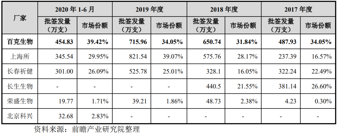除了儿童矮小症,国内成人生长激素缺乏症(GHD)的认知也有待加强。长春高新称,成人生长激素可以覆盖分泌科、脑科、妇科、男科等多个科室,目前国内还需要将病种和病因细分,从而对适应症进行进一步的开发。 根据我国2009-2010年22家医院对垂体瘤术后成人GHD患病率调查结果,垂体泌乳素瘤和无功能性腺瘤患者术后的GHD发生率高达87.8%。 国外生长激素在成人生长激素缺乏的治疗中已起到重要作用。 长春高新称,在通过一系列临床试验以拓展相关适应症,同时通过学术推广、专家共识等方式,持续提升专业人员对相关药品的理解与认知。 在今年4月12日的调研中,长春高新透露,子公司 金赛药业生长激素(水针)用于小于胎龄儿、特发性矮小等适应症处于Ⅲ期临床阶段,长效生长激素用于成人生长激素缺乏适应症处于Ⅱ/Ⅲ期临床试验阶段。 此外,金赛药业在抗肿瘤产品方面,用于血液系统恶性肿瘤、晚期恶性实体瘤和淋巴瘤的金妥利珠单抗已启动国内临床试验,并获得美国FDA药物临床试验批准;通过外部合作等方式,引进甲磺酸亮丙瑞林、重组人促卵泡激素-CTP融合蛋白注射液等项目,进一步增强在儿童健康、女性健康、生殖及肿瘤等领域的技术储备。 根据东方财富证券研报, 金赛药业总投资13亿元的B厂区生长激素二期已经完成试产,待GMP(生产质量管理规范)认证后将在2021年8月投产。 投产后,将为金赛药业巩固行业地位提供产能保障。 新冠疫情加深了人们对疫苗的重视程度,所以才有去年秋冬,流感疫苗一针难求的局面。同年8月25日,百克生物生产的国内唯一流感减毒活疫苗——鼻喷流感减毒活疫苗上市销售,最终 在2020年为百克生物带来3.3亿元销售收入,收入占比为23.08%。 在百克生物的优势领域,水痘疫苗的接种率也还有提升空间。虽然水痘疫苗是预防水痘感染的唯一手段,但 我国儿童平均接种率在区域间差异较大, 东部地区接种率达97.3%,中西部接种率仅为40.8%。目前已有部分城市将其纳入免疫规划疫苗免费接种。 百克生物招股书显示,国内水痘疫苗呈三足鼎立态势。 2020年上半年,百克生物市场份额为39.42%,市场第一。 ▲国内水痘疫苗批签发情况 来源:百克生物招股书 另外,长春高新方面告诉野马财经,公司也在积极推进其他疫苗产品研发工作,其中 带状疱疹疫苗预计2023年上市,鼻喷流感疫苗(水针)预计2023年左右上市,百白破疫苗预计2025年上市。