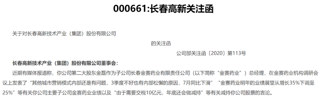在中欧医疗健康的年报和季报中,葛兰多次强调长期看好创新药产业链。在其持仓中,CRO/CDMO等医药外包服务环节、疫苗、创新药企业确实占有很大权重。其中, 长春高新在一季报中净值占比位列第三,仅次于CRO龙头药明康德和“眼茅”爱尔眼科。 前文提到长春高新曾因二股东的言论,股价大跌并收关注函。事件主角金磊,其身份不仅仅是二股东,还是长春高新子公司金赛药业总经理。其在机构调研会上发表的“减持”、“同比下滑”等相关言论,经部分媒体解读后,引来深交所关注函。 ▲来源:长春高新公告 尽管长春高新在回复深交所的公告中对以上言论做了说明,但其影响却反映了金赛药业的重要性。事实上,金赛药业确是长春高新的一把利剑,也是投资者看好长春高新的重要原因。 年报显示,金赛药业的主要产品包括生长激素系列产品和促卵泡素产品等,业务覆盖生殖、肿瘤、自身免疫、神经系统、代谢疾病等领域,是国内的生长激素龙头, 2019年国内市占率约79% 。2019年,长春高新资产重组,对金赛药业持股达到99.5%。