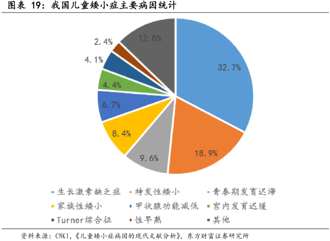 能够被葛兰重仓,自然有更多过人之处。 提起生长激素,很多人恐怕并不十分了解,小编也是如此。但这也从侧面说明了,生长激素还有可为的地方。 长春高新官网介绍,生长激素是由人体脑垂体前叶分泌的一种肽类激素,可促进骨骼生长,促进蛋白质合成,调节脂肪、糖、矿物质代谢等,在人体生长发育过程中发挥重要作用。 重组人生长激素目前主要用于因内源性生长激素缺乏所引起的儿童生长缓慢,即通常所说的儿童矮小,全球销售额约为50亿美元。 东方财富证券援引中华医学会儿科学会内分泌遗传代谢学组统计数据, 我国儿童矮小症的发病率约为3%,其中约51.6%的矮小症可通过生长激素治疗。 ▲来源:东方财富证券研报