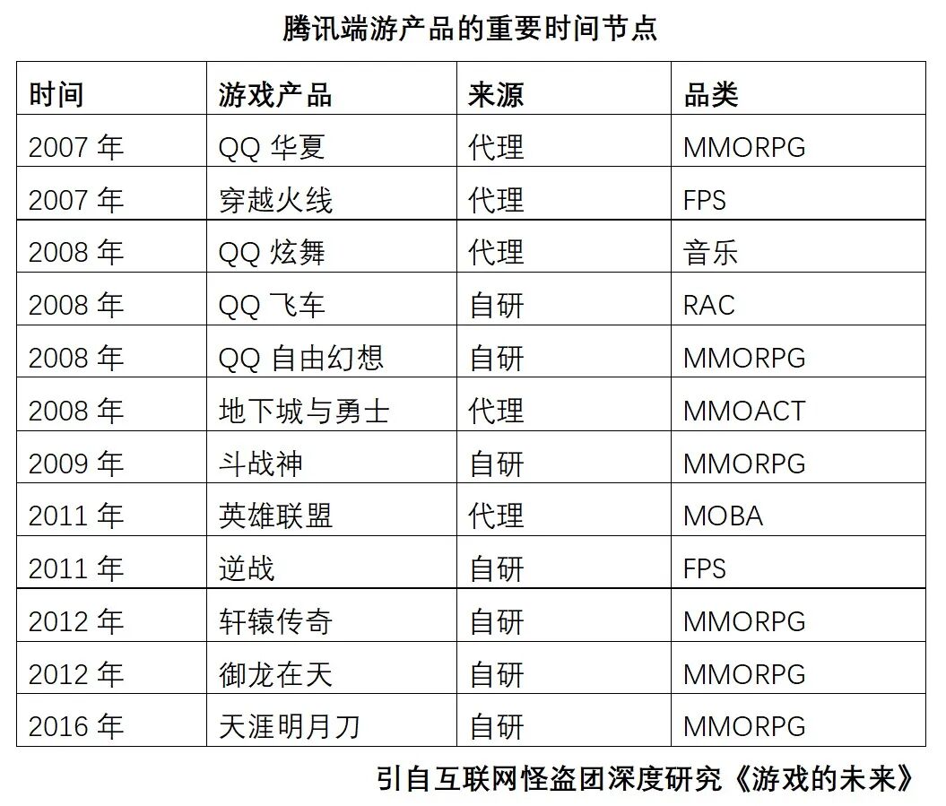 - 2007-08年,腾讯拿到了 《穿越火线》《QQ炫舞》《地下城与勇士》 三个爆款游戏的代理权,它们构成了所谓“腾讯四大名著”当中的三个。尤其是《地下城与勇士》相当成功,把腾讯从端游市场的第三名带到了第一名。在这个时期,腾讯的游戏运营还比较稚嫩,《地下城与勇士》甚至一度被玩家戏称为“掉线城与虚弱勇士”;腾讯通过反复的调整试错,提高自身的运营能力。与此同时,腾讯也拿出了《QQ飞车》《QQ自由幻想》等自研重度游戏,虽然模仿色彩极强,但毕竟是拿出来了。