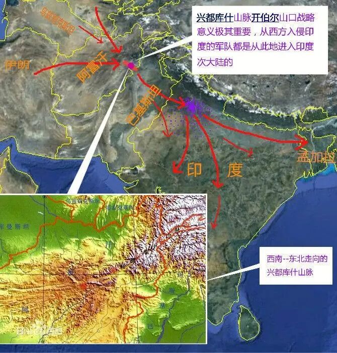 从 兴都库什山脉的开伯尔山口 进来——不管是亚利安人、波斯人还是突厥人统统是从这个山口进入印度次大陆烧杀抢掠然后开启殖民统治。